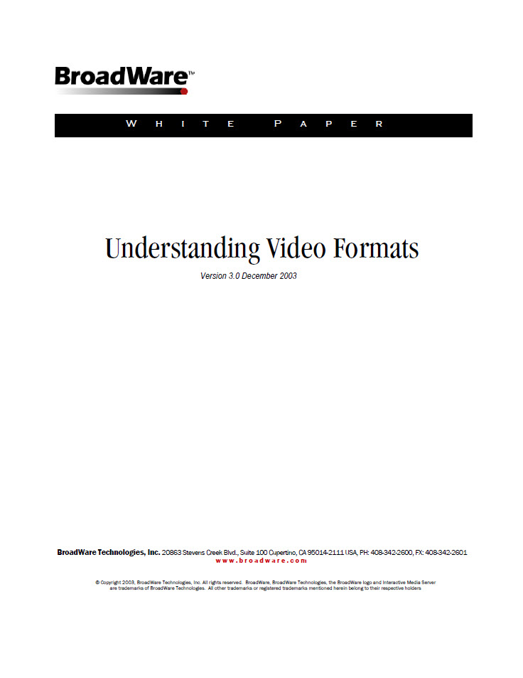 White Paper from BroadWare Technologies, Inc. (circa 2003) on video formats. BroadWare was acquired by Cisco.
