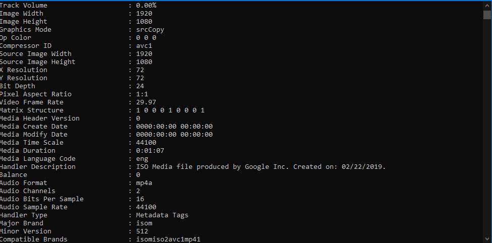 "ExifTool is a platform-independent Perl library plus a command-line application for reading, writing and editing meta information in a wide variety of files. ExifTool supports many different metadata formats"...including video file formats.