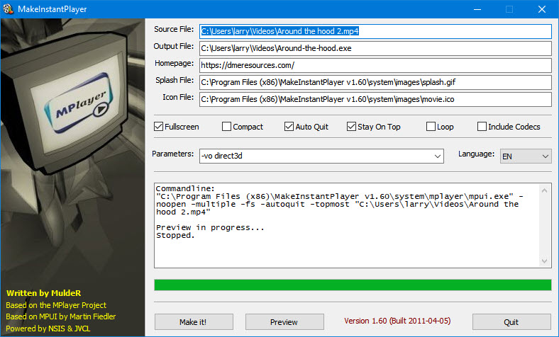 "MuldeR's MakeInstantPlayer is open-source freeware for converting video recordings into self-running executable files. By converting videos to program files, it makes it so they'll run when clicked, without requiring a media player."