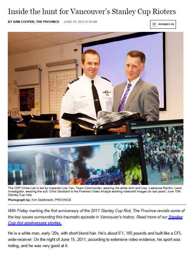 News article from www.theprovince.com about the Vancouver 2011 Riot Investigation, the IRIT team, LEVA, and provides statistics regarding arrests on the one year anniversary.